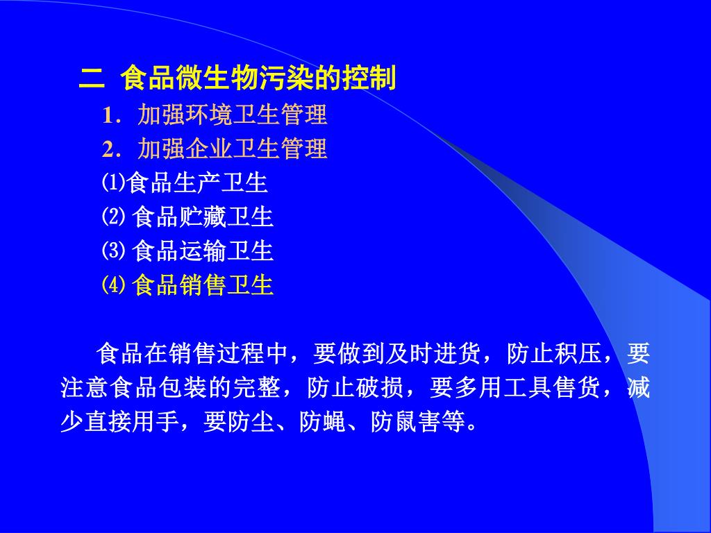 二 食品微生物污染的控制 1.加强环境卫生管理 2.加强企业卫生管理 ⑴食品生产卫生 ⑵ 食品贮藏卫生 ⑶ 食品运输卫生 ⑷ 食品销售卫生 食品在销售过程中,要做到及时进货,防止积压,要注意食品包装的完整,防止破损,要多用工具售货,减少直接用手,要防尘、防蝇、防鼠害等。