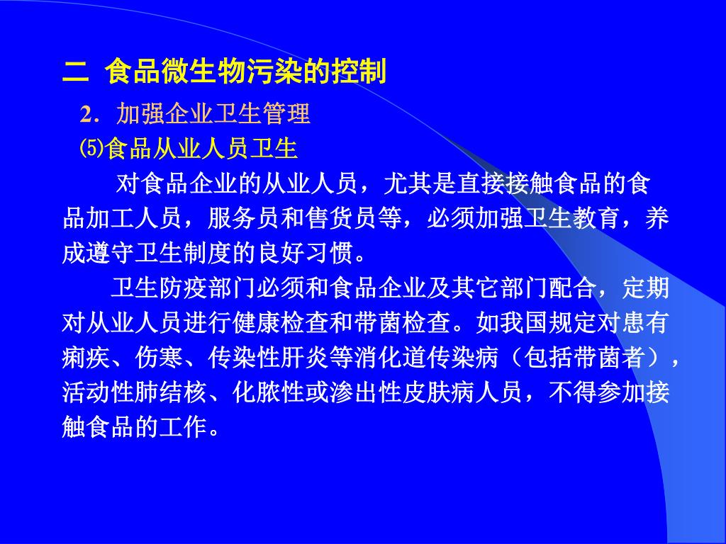 二 食品微生物污染的控制 2.加强企业卫生管理 ⑸食品从业人员卫生 对食品企业的从业人员,尤其是直接接触食品的食品加工人员,服务员和售货员等,必须加强卫生教育,养成遵守卫生制度的良好习惯。 卫生防疫部门必须和食品企业及其它部门配合,定期对从业人员进行健康检查和带菌检查。如我国规定对患有痢疾、伤寒、传染性肝炎等消化道传染病(包括带菌者),活动性肺结核、化脓性或渗出性皮肤病人员,不得参加接触食品的工作。