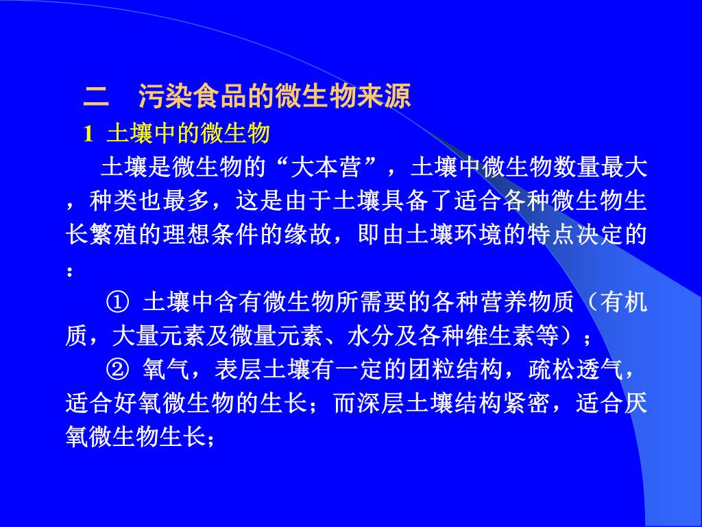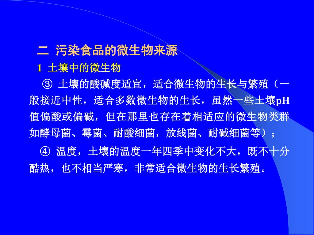 二 污染食品的微生物来源 1 土壤中的微生物 ③土壤的酸碱度适宜,适合微生物的生长与繁殖(一般接近中性,适合多数微生物的生长,虽然一些土壤pH值偏酸或偏碱,但在那里也存在着相适应的微生物类群如酵母菌、霉菌、耐酸细菌,放线菌、耐碱细菌等); ④ 温度,土壤的温度一年四季中变化不大,既不十分酷热,也不相当严寒,非常适合微生物的生长繁殖。