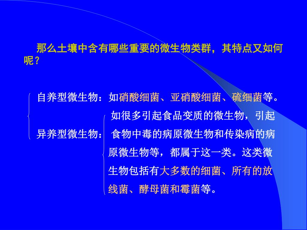 那么土壤中含有哪些重要的微生物类群,其特点又如何呢?那么土壤中含有哪些重要的微生物类群,其特点又如何呢? 自养型微生物:如硝酸细菌、亚硝酸细菌、硫细菌等。 如很多引起食品变质的微生物,引起 异养型微生物: 食物中毒的病原微生物和传染病的病 原微生物等,都属于这一类。这类微 生物包括有大多数的细菌、所有的放 线菌、酵母菌和霉菌等。