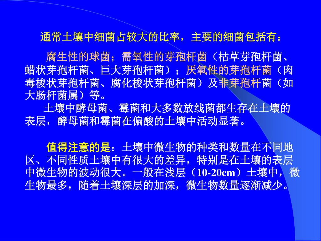 通常土壤中细菌占较大的比率,主要的细菌包括有:通常土壤中细菌占较大的比率,主要的细菌包括有: 腐生性的球菌;需氧性的芽孢杆菌(枯草芽孢杆菌、蜡状芽孢杆菌、巨大芽孢杆菌);厌氧性的芽孢杆菌(肉毒梭状芽孢杆菌、腐化梭状芽孢杆菌)及非芽孢杆菌(如大肠杆菌属)等。 土壤中酵母菌、霉菌和大多数放线菌都生存在土壤的表层,酵母菌和霉菌在偏酸的土壤中活动显著。 值得注意的是:土壤中微生物的种类和数量在不同地区、不同性质土壤中有很大的差异,特别是在土壤的表层中微生物的波动很大。一般在浅层(10-20cm)土壤中,微生物最多,随着土壤深层的加深,微生物数量逐渐减少。