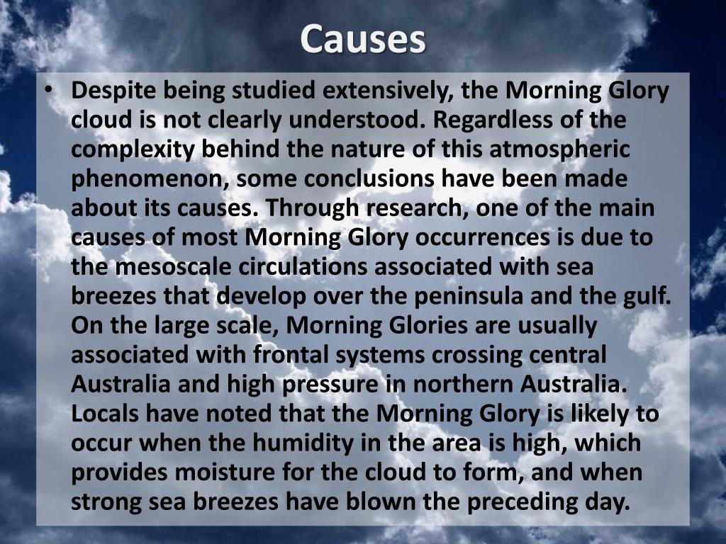 Causes • Despite being studied extensively, the Morning Glory cloud is not clearly understood. Regardless of the complexity behind the nature of this atmospheric phenomenon, some conclusions have been made about its causes. Through research, one of the main causes of most Morning Glory occurrences is due to the mesoscale circulations associated with sea breezes that develop over the peninsula and the gulf. On the large scale, Morning Glories are usually associated with frontal systems crossing central Australia and high pressure in northern Australia. Locals have noted that the Morning Glory is likely to occur when the humidity in the area is high, which provides moisture for the cloud to form, and when strong sea breezes have blown the preceding day.