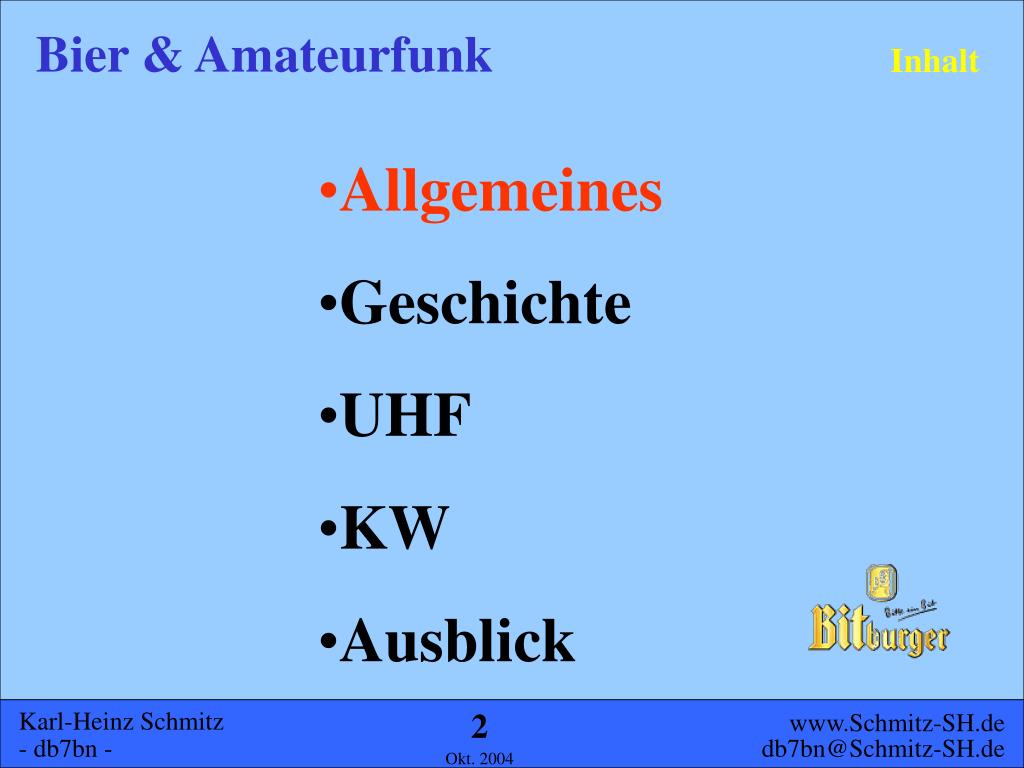 Inhalt. Allgemeines Geschichte UHF KW Ausblick. Inhalt. Allgemeines Geschichte UHF KW Ausblick. Allgemeines. Drei Fragen die Funkamateure schon seit Jahrzehnten beschäftigen. 1. Wie kommt die HF in die Luft ?. Antenne. 2. Wie geht der Durst weg ?. Bier.