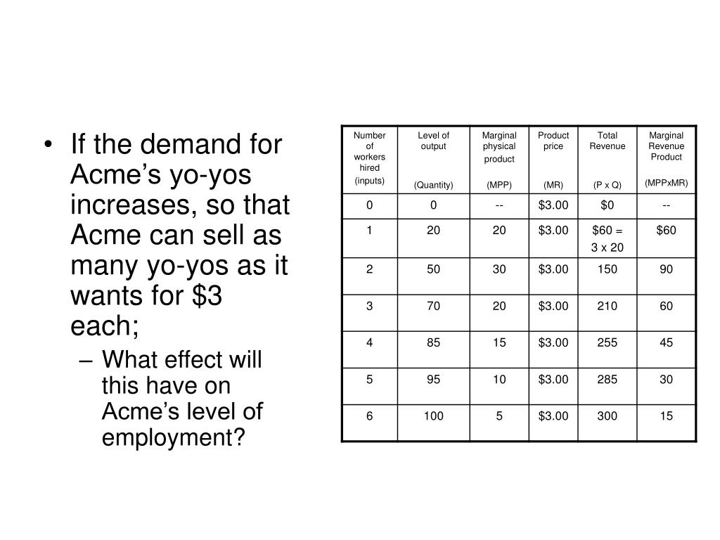 A firm should hire another worker as long as the marginal revenue product is not exceeded by her or his wage • If the demand for Acme’s yo-yos increases, so that Acme can sell as many yo-yos as it wants for $3 each; • What effect will this have on Acme’s level of employment?