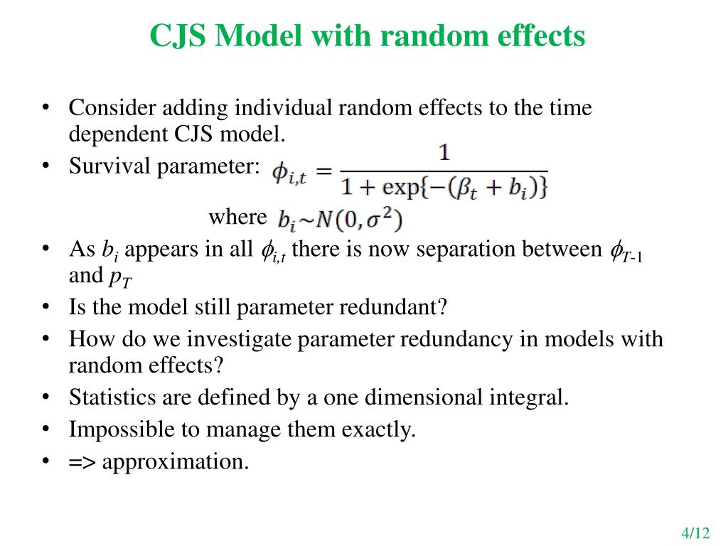 CJS Model with random effects • Consider adding individual random effects to the time dependent CJS model. • Survival parameter: where • As bi appears in all i,t there is now separation between T-1 and pT • Is the model still parameter redundant? • How do we investigate parameter redundancy in models with random effects? • Statistics are defined by a one dimensional integral. • Impossible to manage them exactly. • => approximation.