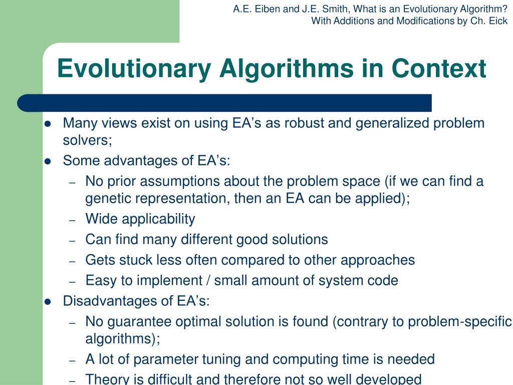 Evolutionary Algorithms in Context • Many views exist on using EA’s as robust and generalized problem solvers; • Some advantages of EA’s: • No prior assumptions about the problem space (if we can find a genetic representation, then an EA can be applied); • Wide applicability • Can find many different good solutions • Gets stuck less often compared to other approaches • Easy to implement / small amount of system code • Disadvantages of EA’s: • No guarantee optimal solution is found (contrary to problem-specific algorithms); • A lot of parameter tuning and computing time is needed • Theory is difficult and therefore not so well developed