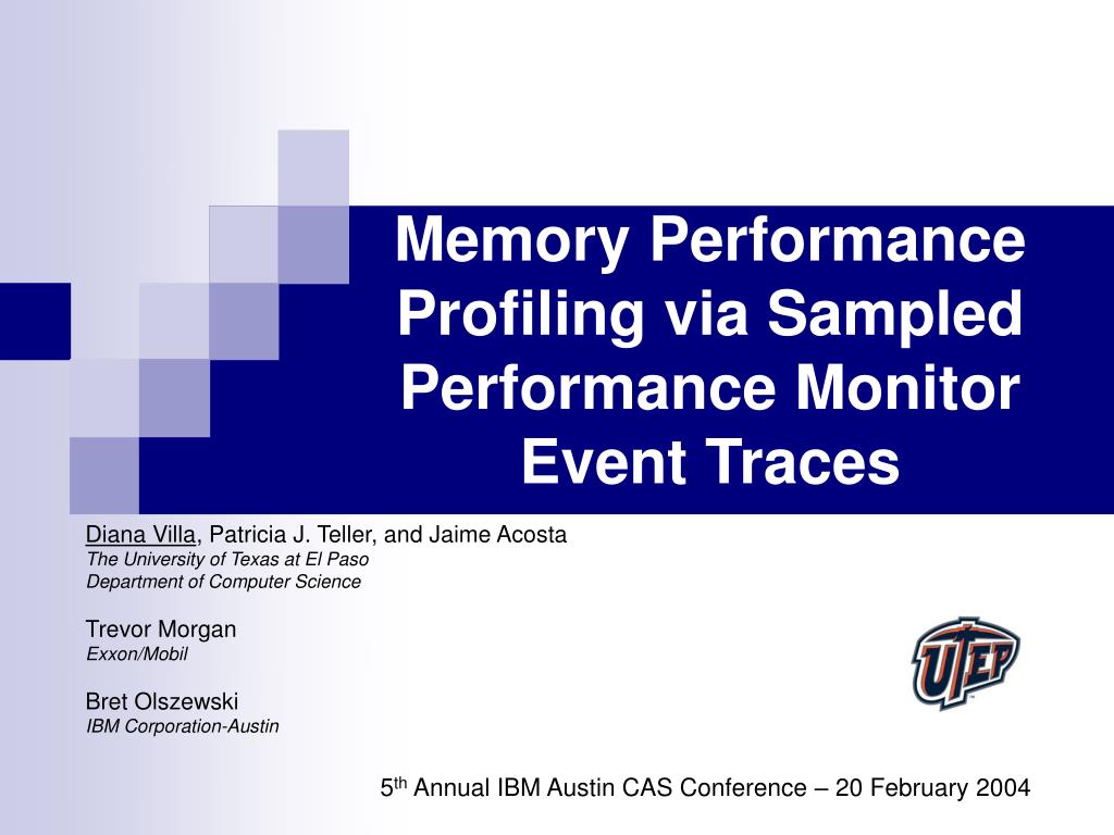 Memory Performance Profiling via Sampled Performance Monitor Event Traces. Diana Villa , Patricia J. Teller, and Jaime Acosta The University of Texas at El Paso Department of Computer Science Trevor Morgan Exxon/Mobil Bret Olszewski IBM Corporation-Austin.