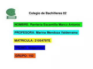 Colegio de Bachilleres 02 NOMBRE: Renteria Escamilla Marco Antonio PROFESORA: Marina Mendoza Valderrama MATRICULA: 21054797E TRUNO: Vespertino GRUPO: 152