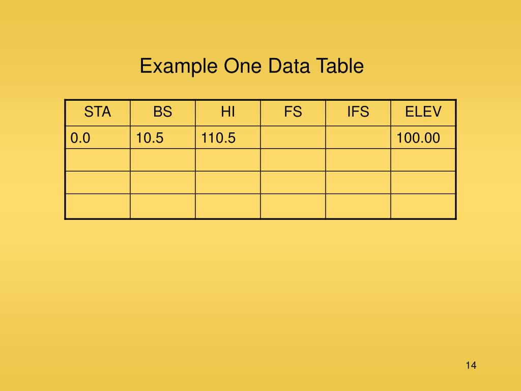 Example One-cont. Step 4: Start recording the rod readings for each station. Note: station 100 is not used as a benchmark or as a turning point, therefore it is an intermediate foresight.