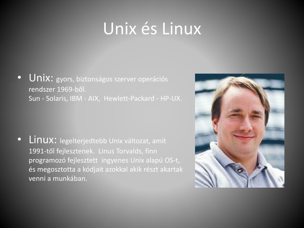 Unix és Linux • Unix: gyors, biztonságos szerver operációs rendszer 1969-ből. Sun - Solaris, IBM - AIX, Hewlett-Packard - HP-UX. • Linux: legelterjedtebb Unix változat, amit 1991-től fejlesztenek.LinusTorvalds, finn programozó fejlesztett ingyenes Unix alapú OS-t, és megosztotta a kódjait azokkal akik részt akartak venni a munkában.