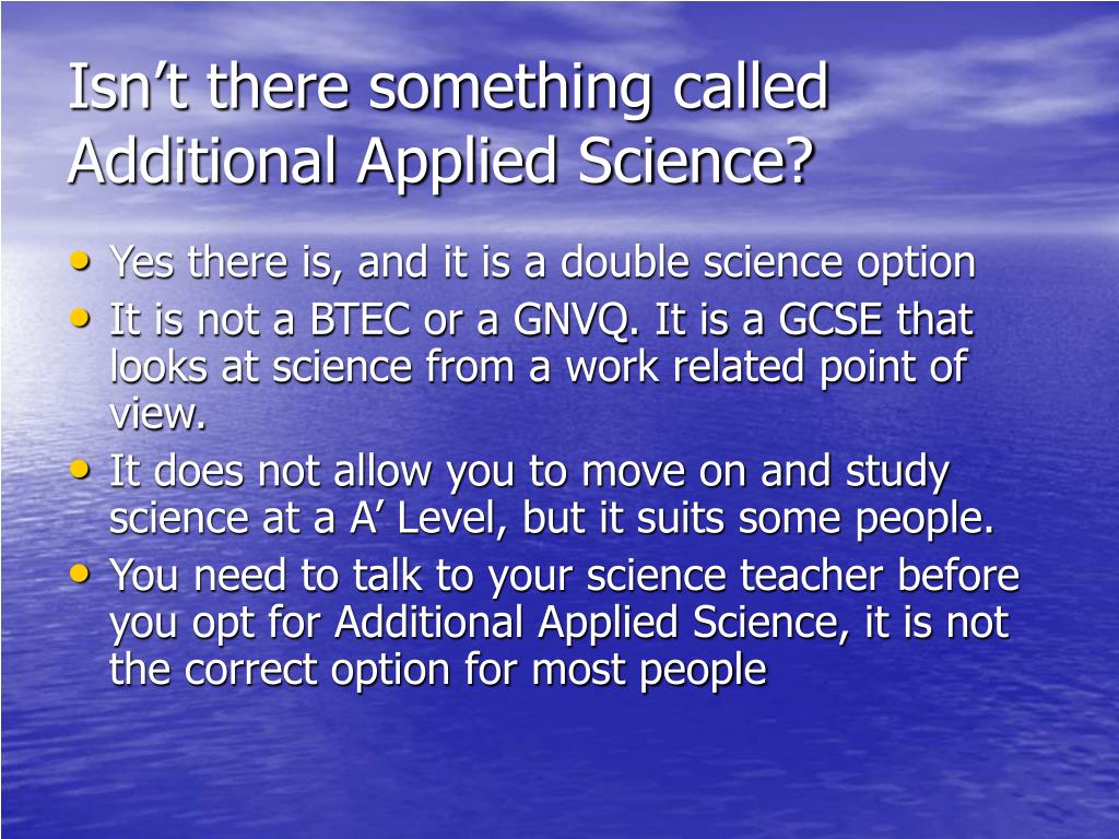 Isn’t there something called Additional Applied Science? • Yes there is, and it is a double science option • It is not a BTEC or a GNVQ. It is a GCSE that looks at science from a work related point of view. • It does not allow you to move on and study science at a A’ Level, but it suits some people. • You need to talk to your science teacher before you opt for Additional Applied Science, it is not the correct option for most people