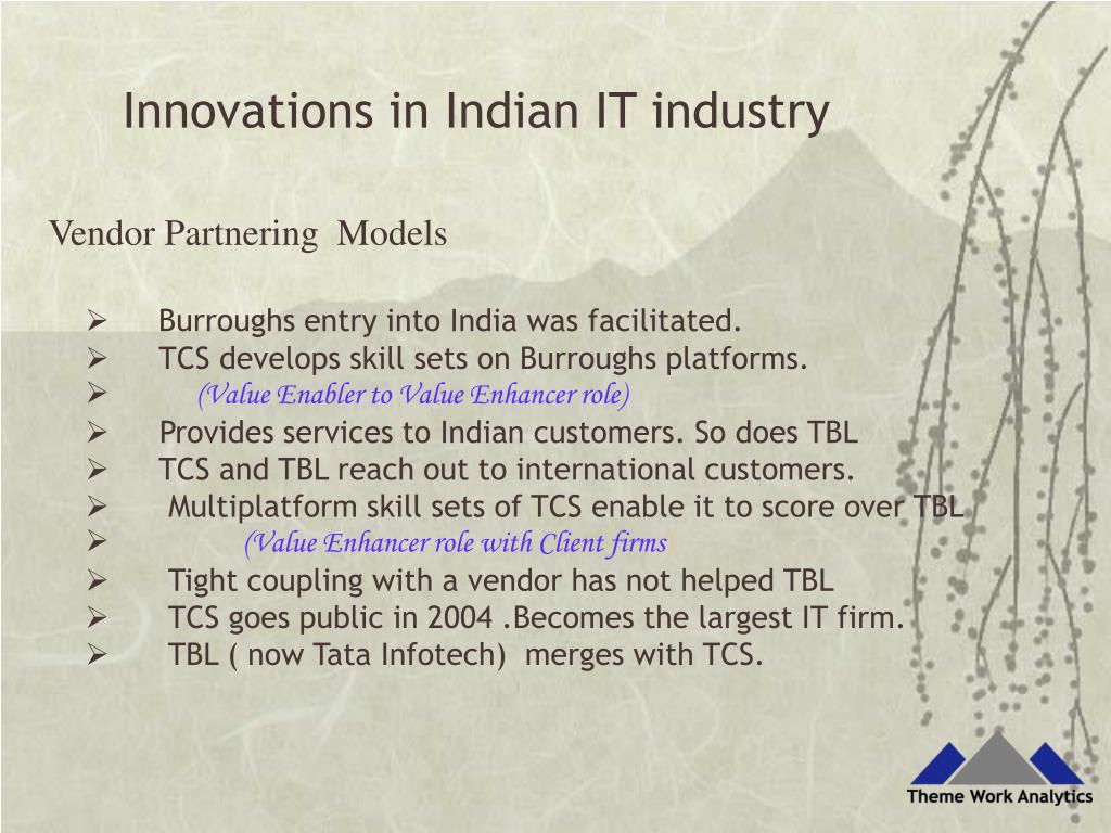 Innovations in Indian IT industry Vendor Partnering Models • Burroughs entry into India was facilitated. • TCS develops skill sets on Burroughs platforms. • (Value Enabler to Value Enhancer role) • Provides services to Indian customers. So does TBL • TCS and TBL reach out to international customers. • Multiplatform skill sets of TCS enable it to score over TBL • (Value Enhancer role with Client firms) • Tight coupling with a vendor has not helped TBL • TCS goes public in 2004 .Becomes the largest IT firm. • TBL ( now Tata Infotech) merges with TCS.
