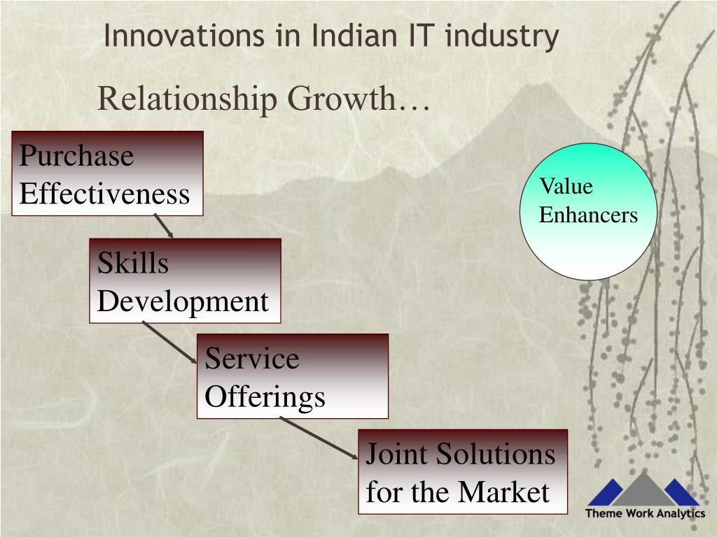 Innovations in Indian IT industry Relationship Growth… Purchase Effectiveness Value Enhancers Skills Development Service Offerings Joint Solutions for the Market