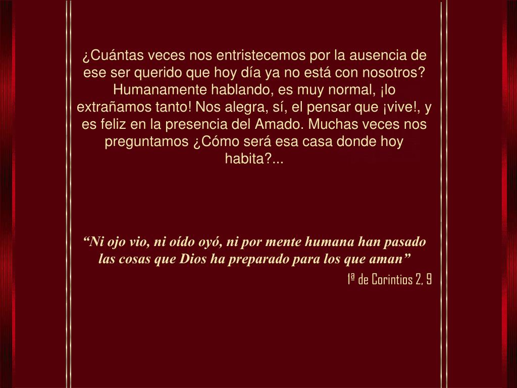 ¿Cuántas veces nos entristecemos por la ausencia de ese ser querido que hoy día ya no está con nosotros? Humanamente hablando, es muy normal, ¡lo extrañamos tanto! Nos alegra, sí, el pensar que ¡vive!, y es feliz en la presencia del Amado. Muchas veces nos preguntamos ¿Cómo será esa casa donde hoy habita?... “Ni ojo vio, ni oído oyó, ni por mente humana han pasado las cosas que Dios ha preparado para los que aman” 1ª de Corintios 2, 9