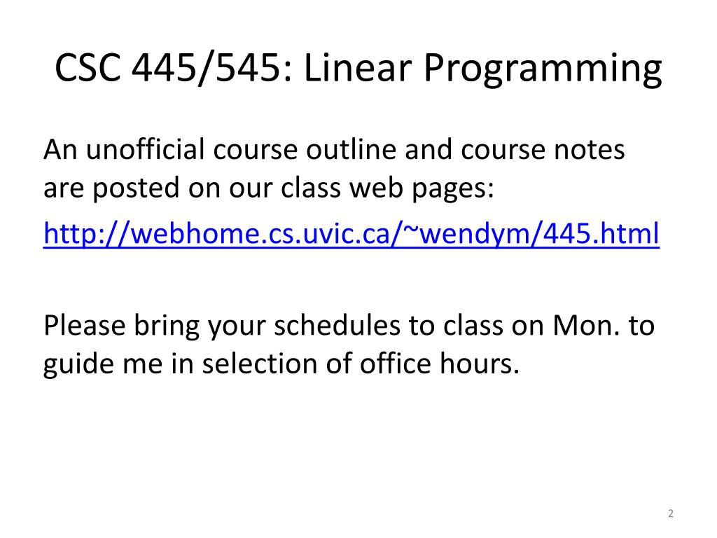 CSC 445/545: Linear Programming An unofficial course outline and course notes are posted on our class web pages: http://webhome.cs.uvic.ca/~wendym/445.html Please bring your schedules to class on Mon. to guide me in selection of office hours.