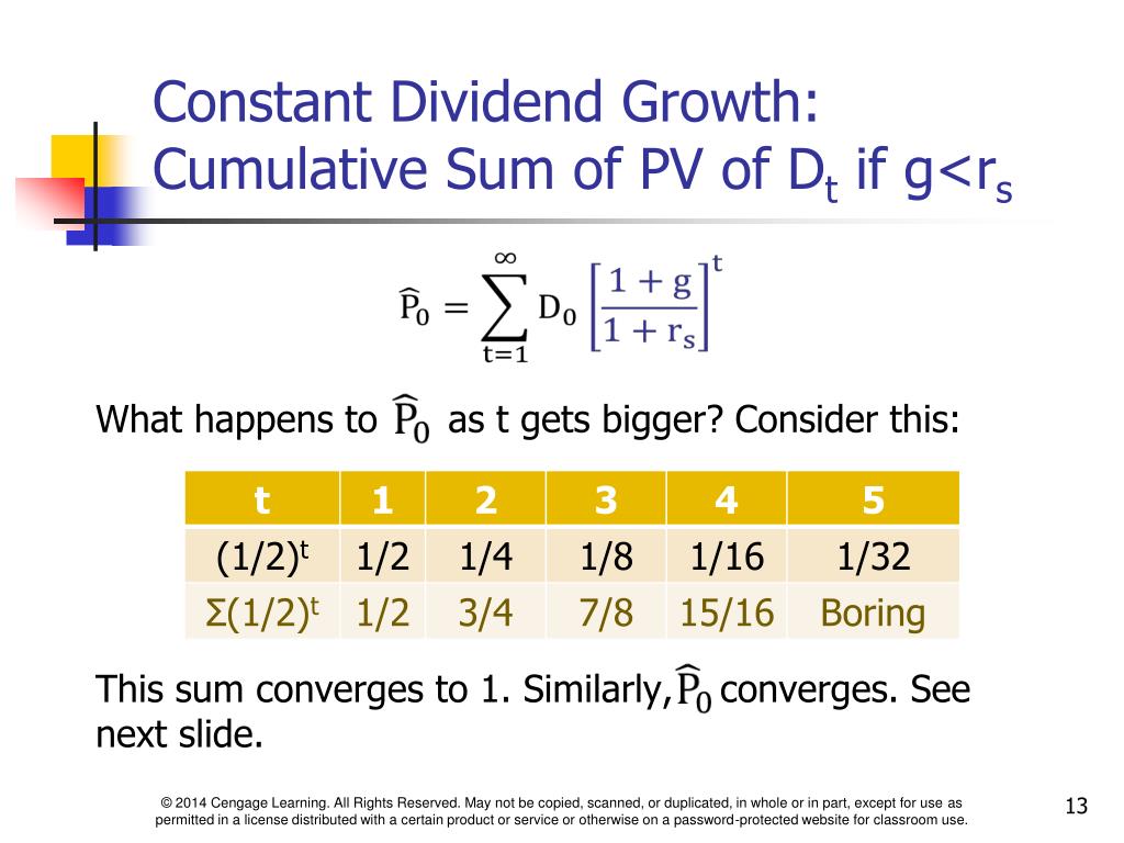 Constant Dividend Growth:Cumulative Sum of PV of Dt if g<rs What happens to as t gets bigger? Consider this: This sum converges to 1. Similarly, converges. See next slide.