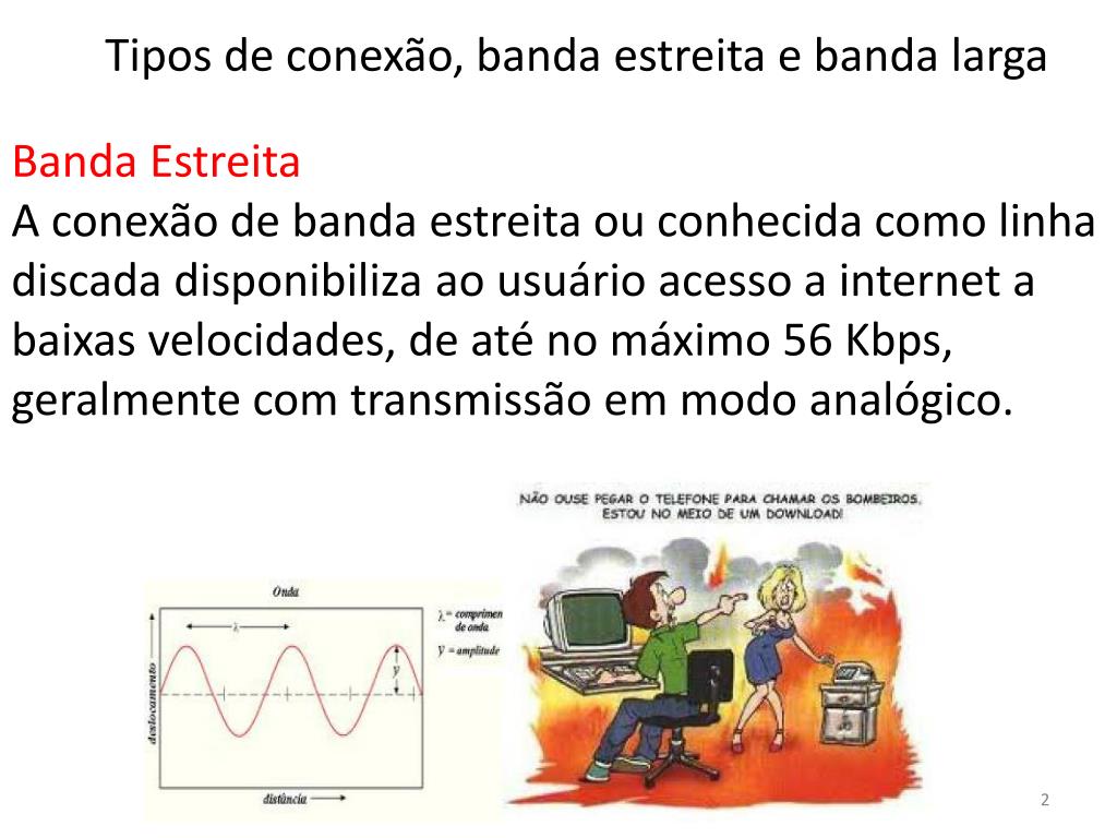 Tipos de conexão, banda estreita e banda larga Banda Estreita A conexão de banda estreita ou conhecida como linha discada disponibiliza ao usuário acesso a internet a baixas velocidades, de até no máximo 56 Kbps, geralmente com transmissão em modo analógico.