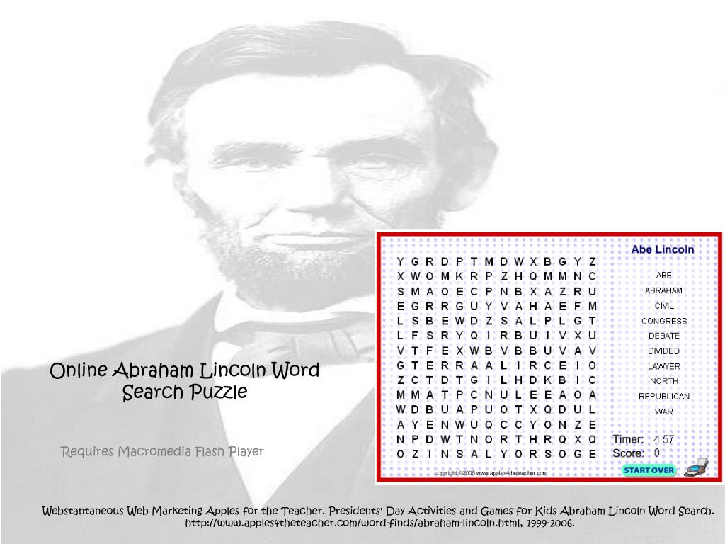 Online Abraham Lincoln Word Search Puzzle Requires Macromedia Flash Player Webstantaneous Web Marketing Apples for the Teacher. Presidents' Day Activities and Games for Kids Abraham Lincoln Word Search. http://www.apples4theteacher.com/word-finds/abraham-lincoln.html, 1999-2006.
