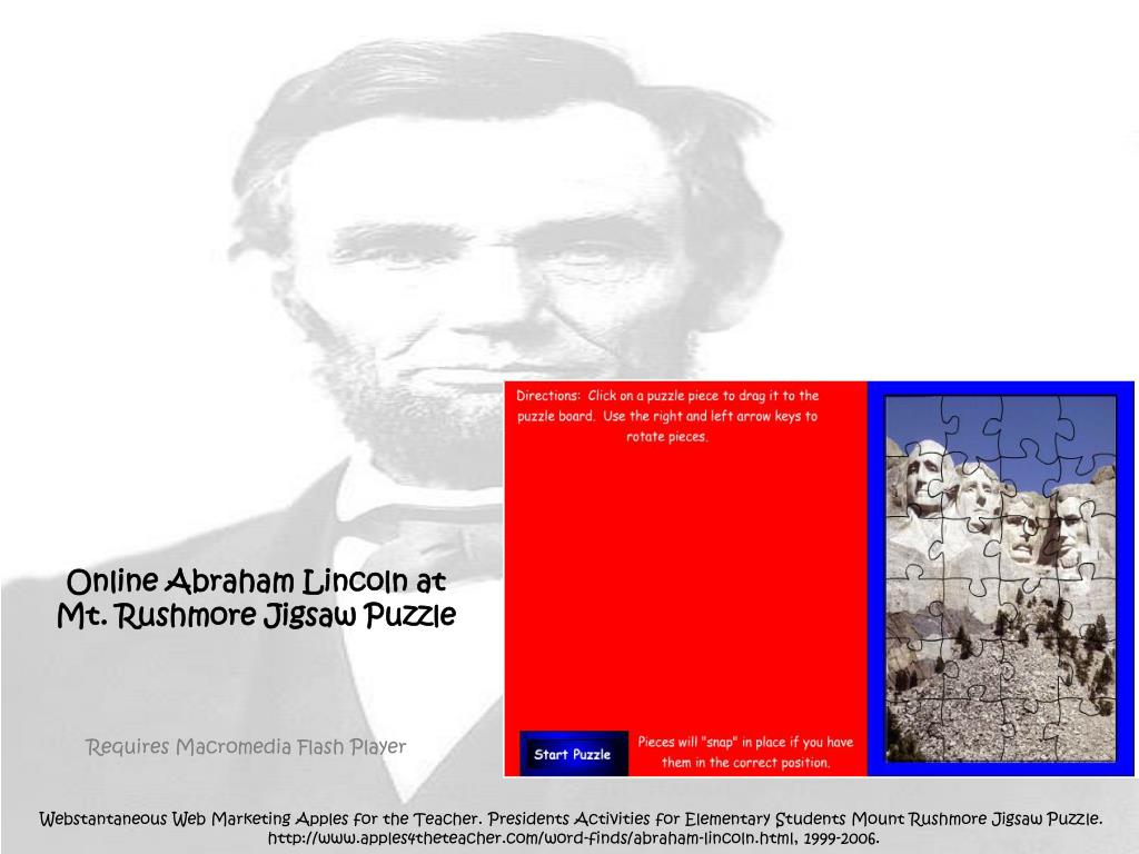 Online Abraham Lincoln at Mt. Rushmore Jigsaw Puzzle Requires Macromedia Flash Player Webstantaneous Web Marketing Apples for the Teacher. Presidents Activities for Elementary Students Mount Rushmore Jigsaw Puzzle. http://www.apples4theteacher.com/word-finds/abraham-lincoln.html, 1999-2006.