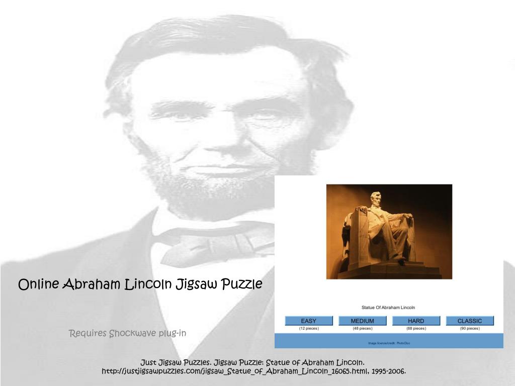 Online Abraham Lincoln Jigsaw Puzzle Requires Shockwave plug-in Just Jigsaw Puzzles. Jigsaw Puzzle: Statue of Abraham Lincoln. http://justjigsawpuzzles.com/jigsaw_Statue_of_Abraham_Lincoln_16065.html, 1995-2006.