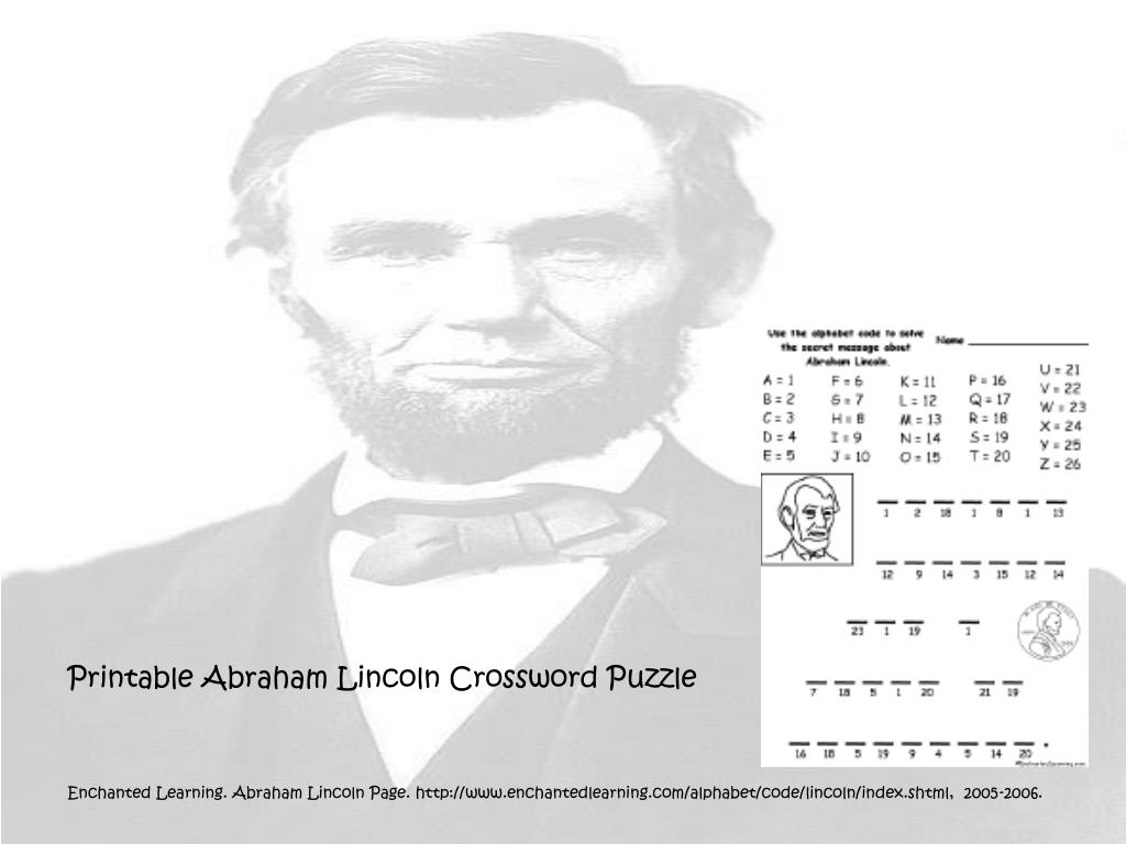 Printable Abraham Lincoln Crossword Puzzle Enchanted Learning. Abraham Lincoln Page. http://www.enchantedlearning.com/alphabet/code/lincoln/index.shtml, 2005-2006.