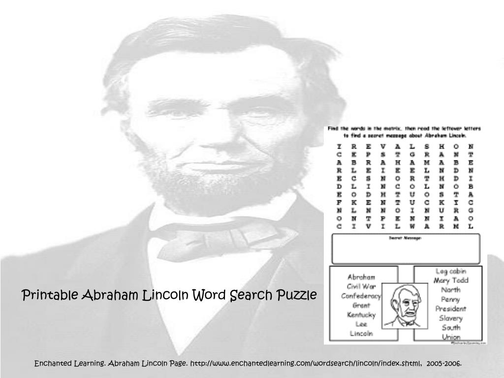 Printable Abraham Lincoln Word Search Puzzle Enchanted Learning. Abraham Lincoln Page. http://www.enchantedlearning.com/wordsearch/lincoln/index.shtml, 2005-2006.