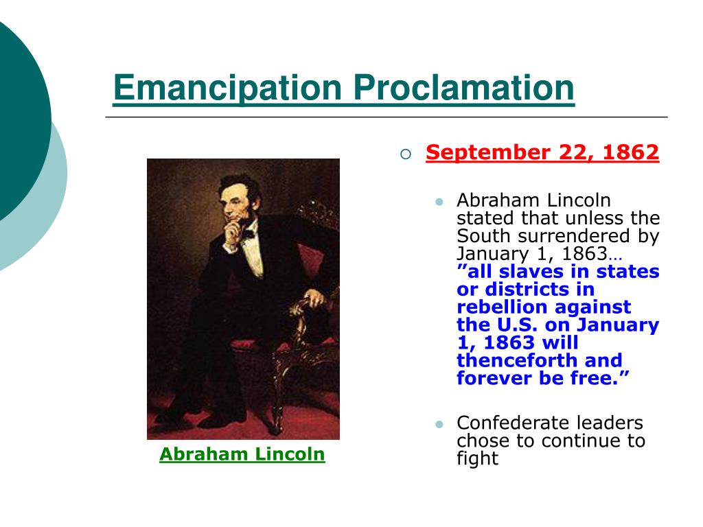 Emancipation Proclamation • September 22, 1862 • Abraham Lincoln stated that unless the South surrendered by January 1, 1863… ”all slaves in states or districts in rebellion against the U.S. on January 1, 1863 will thenceforth and forever be free.” • Confederate leaders chose to continue to fight Abraham Lincoln