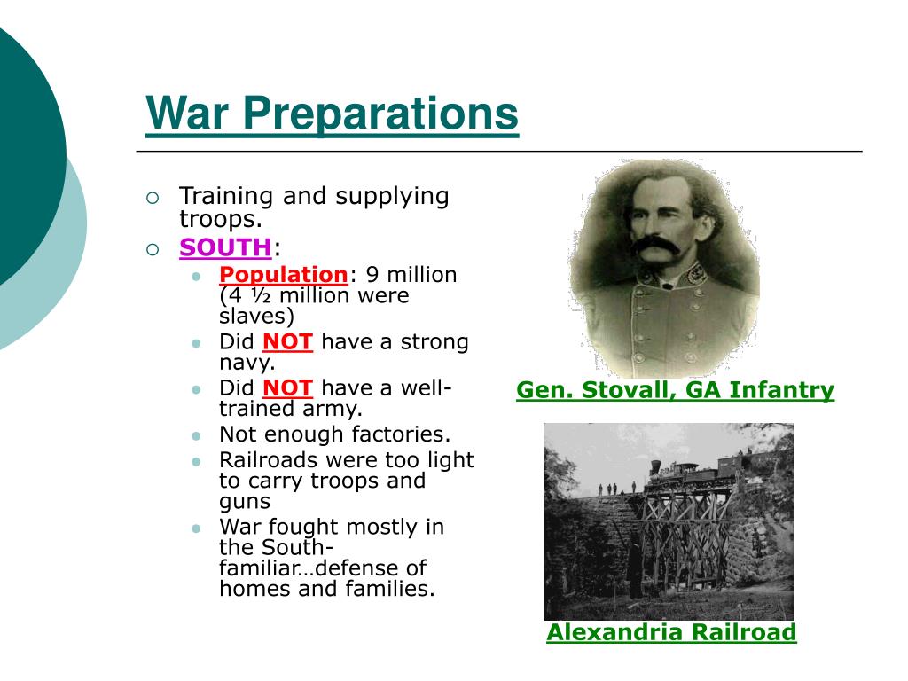 War Preparations • Training and supplying troops. • SOUTH: • Population: 9 million (4 ½ million were slaves) • Did NOT have a strong navy. • Did NOT have a well-trained army. • Not enough factories. • Railroads were too light to carry troops and guns • War fought mostly in the South-familiar…defense of homes and families. Gen. Stovall, GA Infantry Alexandria Railroad
