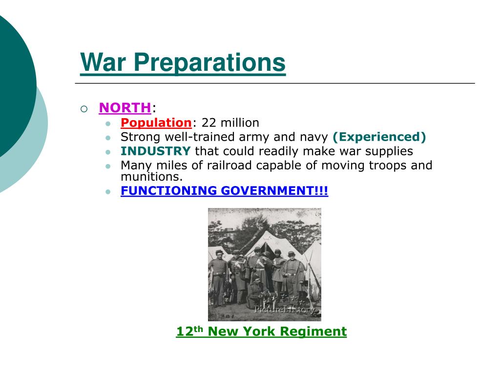 War Preparations • NORTH: • Population: 22 million • Strong well-trained army and navy (Experienced) • INDUSTRY that could readily make war supplies • Many miles of railroad capable of moving troops and munitions. • FUNCTIONING GOVERNMENT!!! 12th New York Regiment