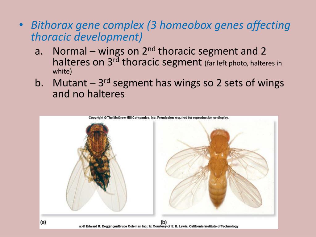Bithorax gene complex (3 homeobox genes affecting thoracic development) • Normal – wings on 2nd thoracic segment and 2 halteres on 3rd thoracic segment (far left photo, halteres in white) • Mutant – 3rd segment has wings so 2 sets of wings and no halteres