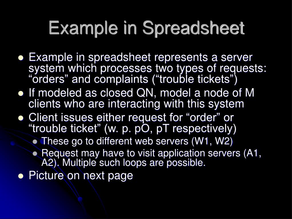 Example in Spreadsheet • Example in spreadsheet represents a server system which processes two types of requests: “orders” and complaints (“trouble tickets”) • If modeled as closed QN, model a node of M clients who are interacting with this system • Client issues either request for “order” or “trouble ticket” (w. p. pO, pT respectively) • These go to different web servers (W1, W2) • Request may have to visit application servers (A1, A2). Multiple such loops are possible. • Picture on next page