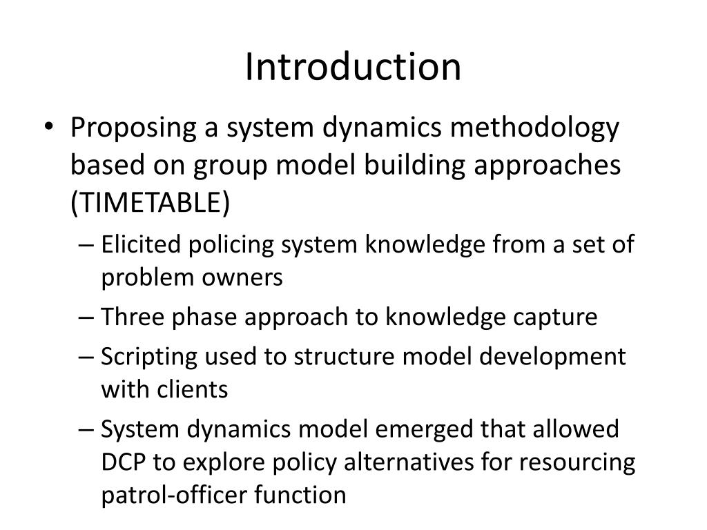 Introduction • Proposing a system dynamics methodology based on group model building approaches (TIMETABLE) • Elicited policing system knowledge from a set of problem owners • Three phase approach to knowledge capture • Scripting used to structure model development with clients • System dynamics model emerged that allowed DCP to explore policy alternatives for resourcing patrol-officer function