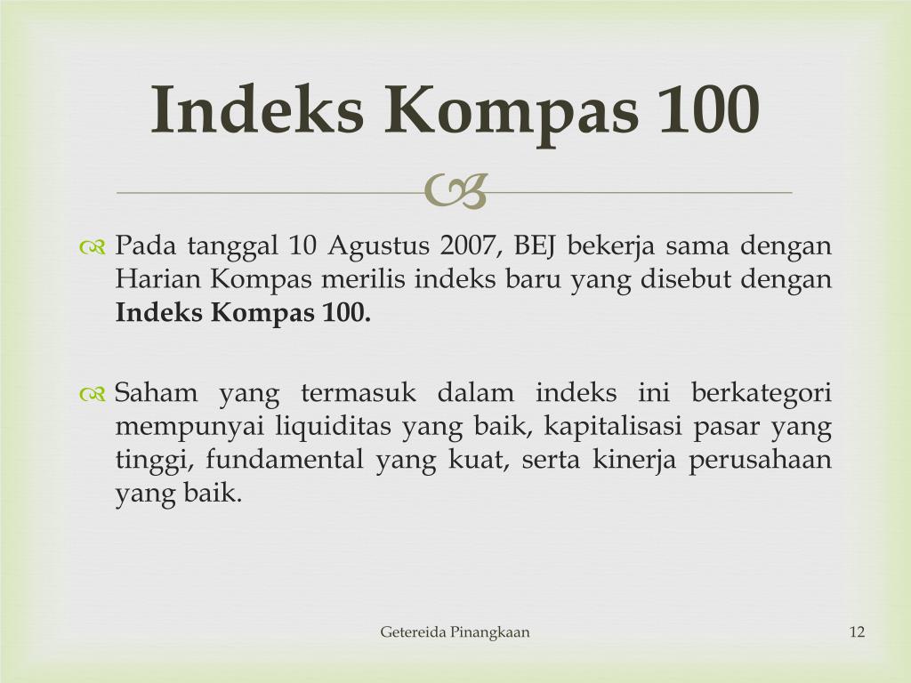 Indeks Kompas 100 • Pada tanggal 10 Agustus 2007, BEJ bekerja sama dengan Harian Kompas merilis indeks baru yang disebut dengan Indeks Kompas 100. • Saham yang termasuk dalam indeks ini berkategori mempunyai liquiditas yang baik, kapitalisasi pasar yang tinggi, fundamental yang kuat, serta kinerja perusahaan yang baik. Getereida Pinangkaan