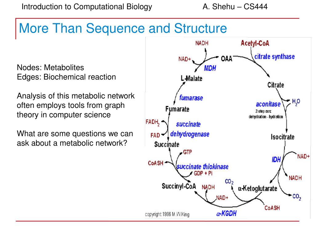 More Than Sequence and Structure Nodes: Metabolites Edges: Biochemical reaction Analysis of this metabolic network often employs tools from graph theory in computer science What are some questions we can ask about a metabolic network?