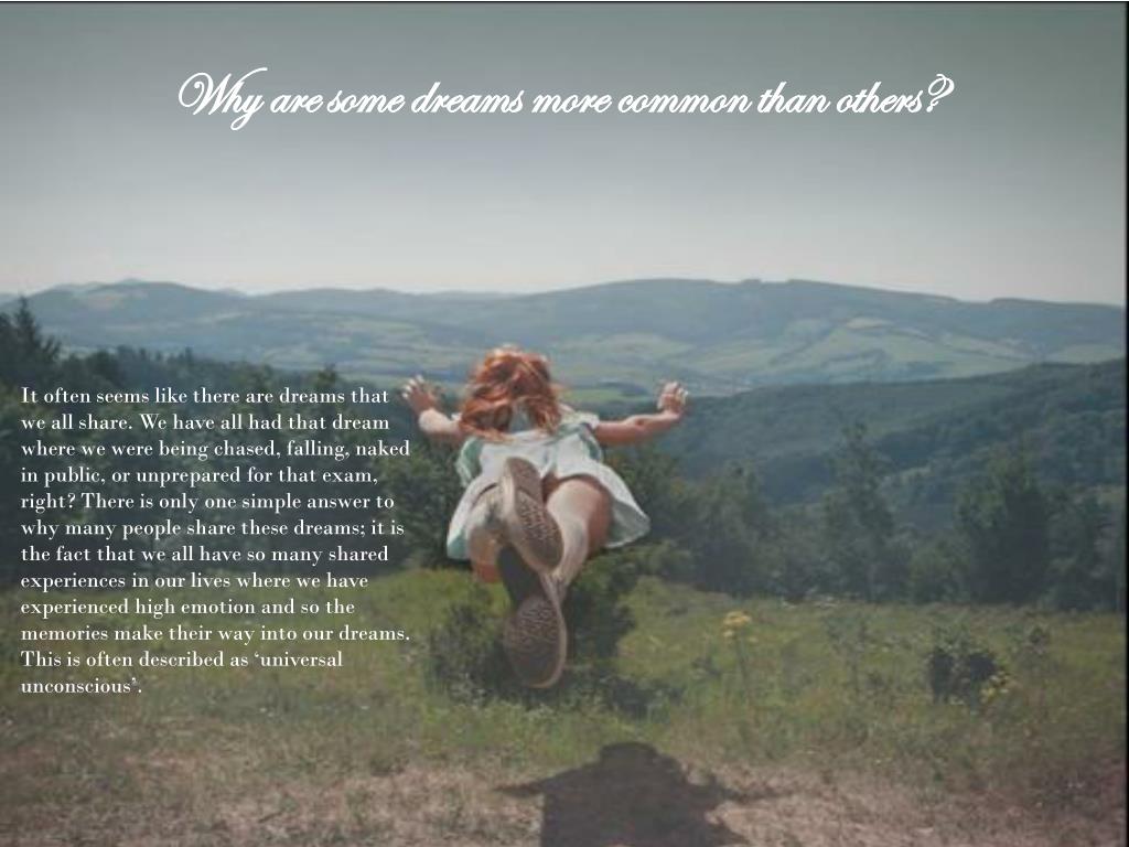 Why are some dreams more common than others? It often seems like there are dreams that we all share. We have all had that dream where we were being chased, falling, naked in public, or unprepared for that exam, right? There is only one simple answer to why many people share these dreams; it is the fact that we all have so many shared experiences in our lives where we have experienced high emotion and so the memories make their way into our dreams. This is often described as ‘universal unconscious’.