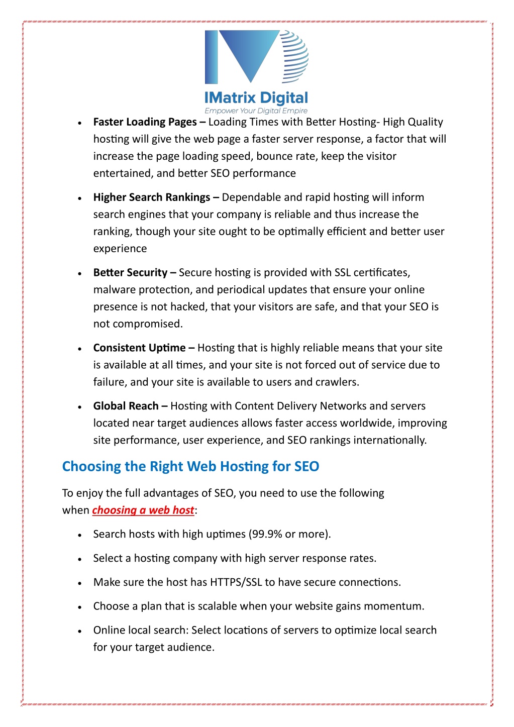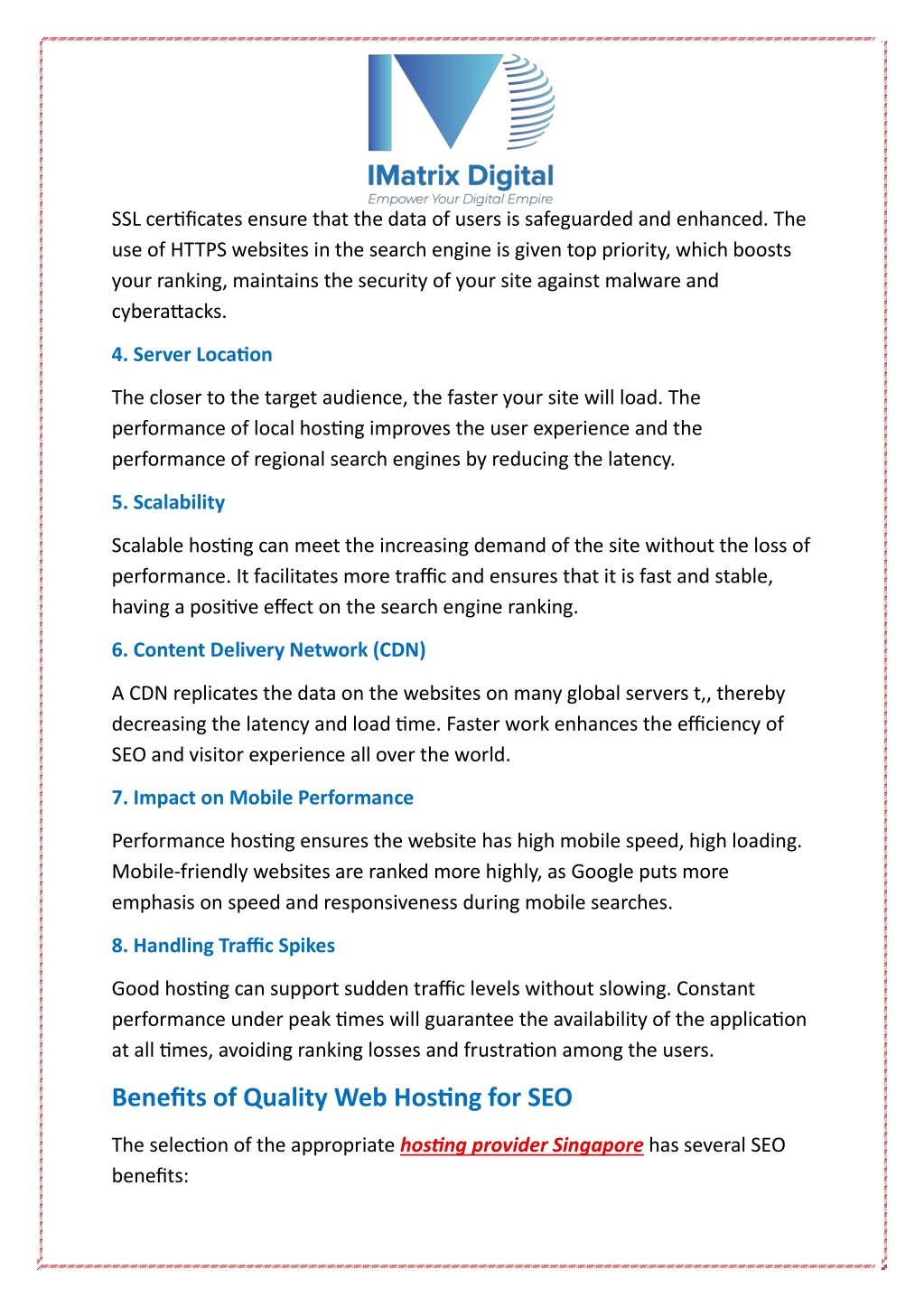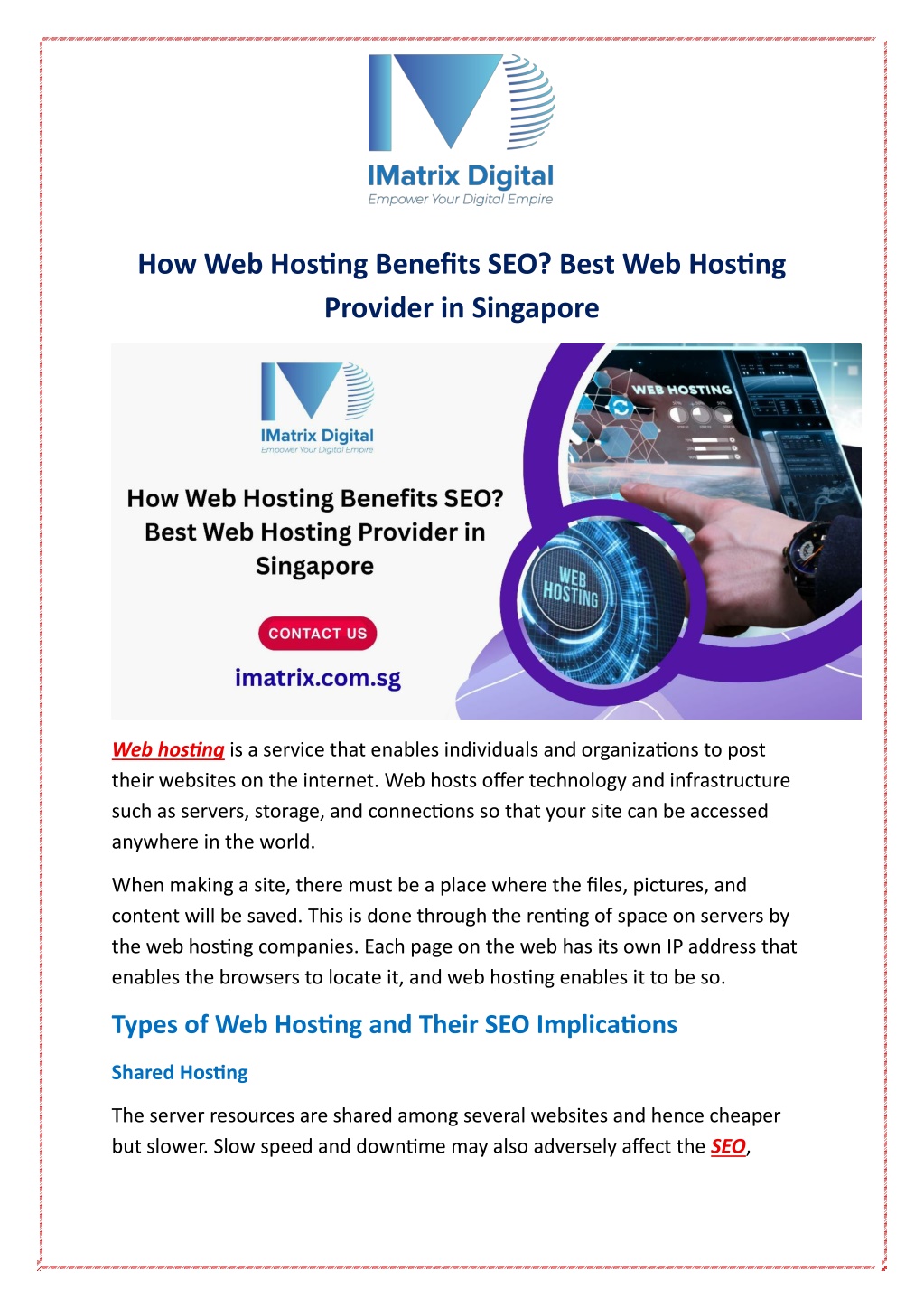 Conclusion High-quality web hostinghas a direct influence on SEO, as it enhances site speed, site uptime, security, and mobile performance. One of the best solutions is to select a trusted, scalable host that has local servers and a CDN, which would result in improved user experience, higher search results, and the ability to grow online in the long run. For More Information Visit Our Website: https://imatrix.com.sg/blogs/how-web-hosting-benefits-seo-best- web-hosting-provider-in-singapore/