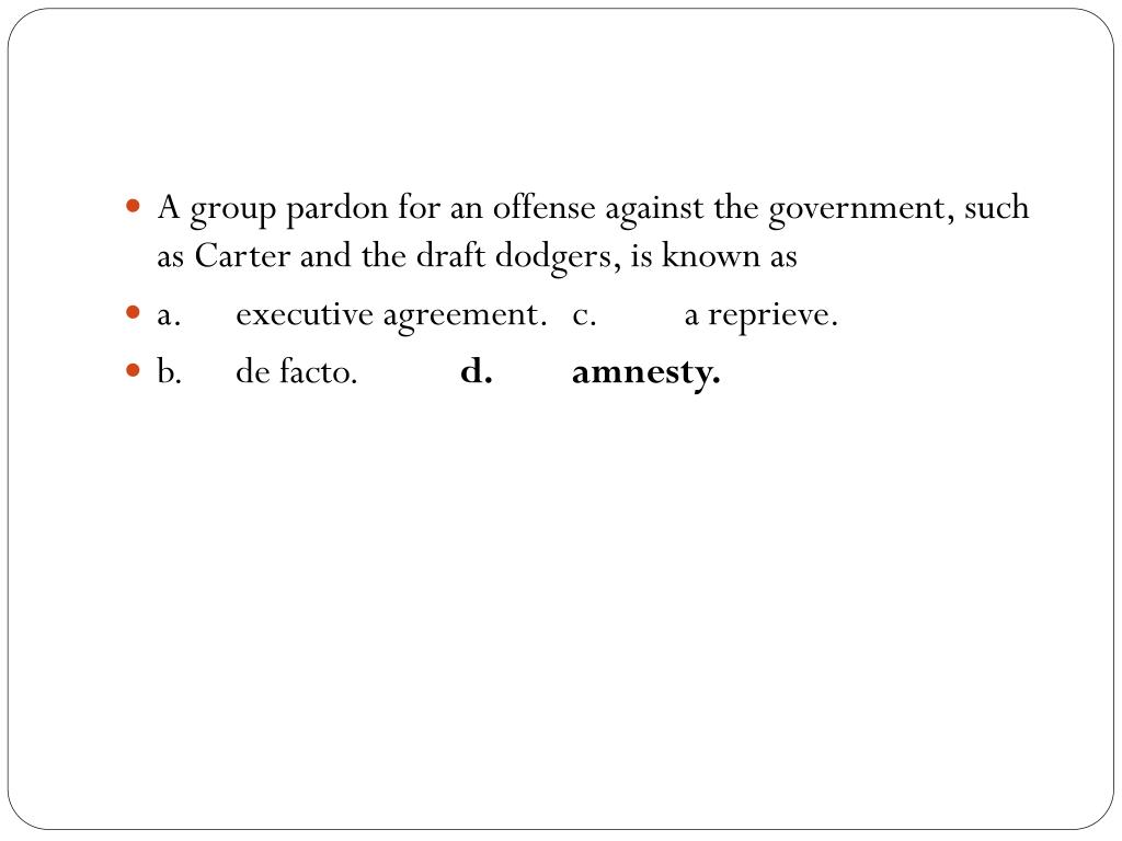 A group pardon for an offense against the government, such as Carter and the draft dodgers, is known as • a. executive agreement. c. a reprieve. • b. de facto. d. amnesty.