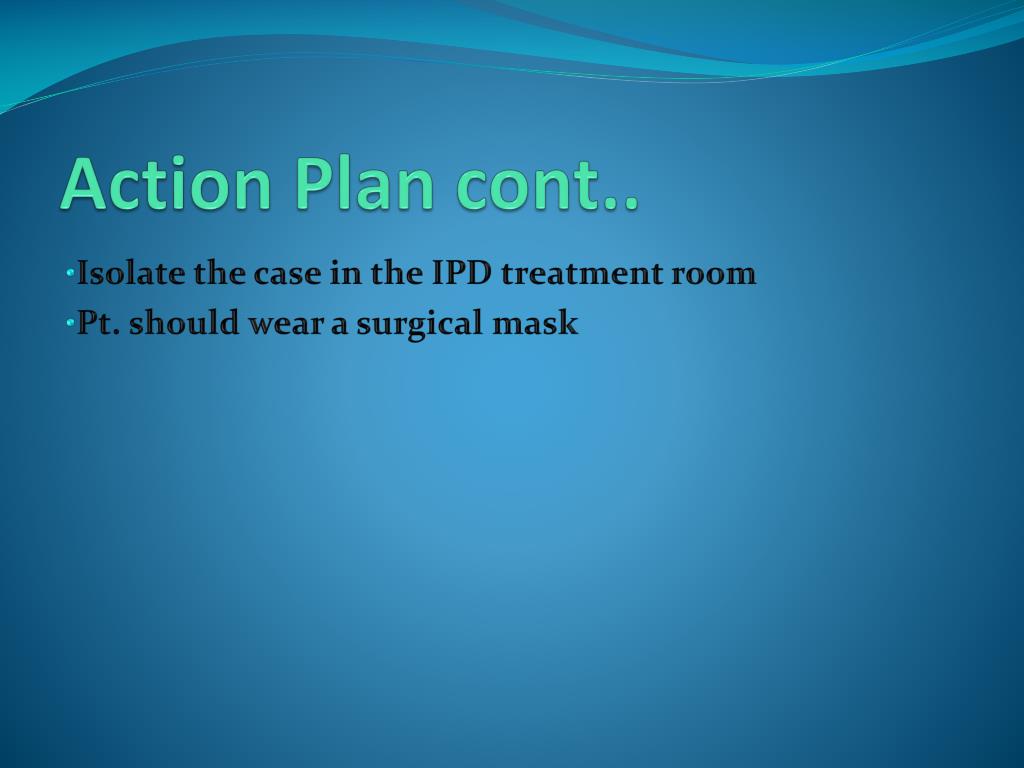 Action Plan cont.. Isolate the case in the IPD treatment room Pt. should wear a surgical mask