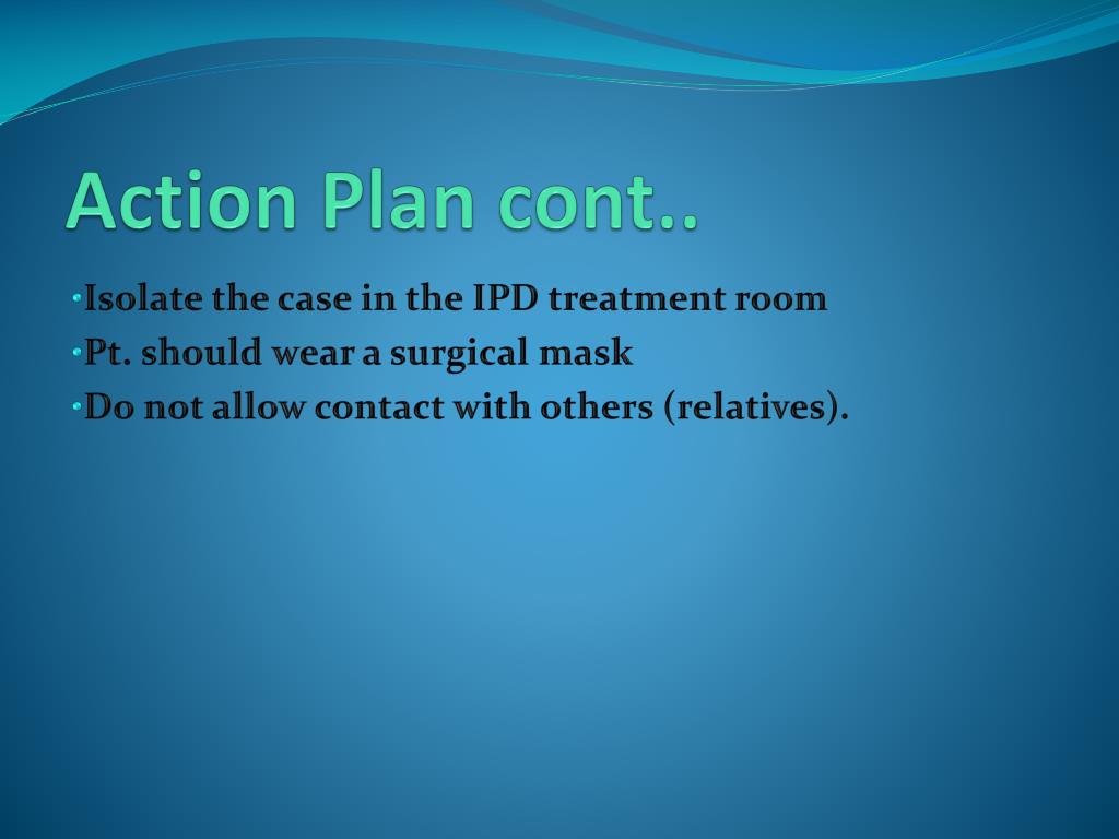Action Plan cont.. Isolate the case in the IPD treatment room Pt. should wear a surgical mask Do not allow contact with others (relatives).