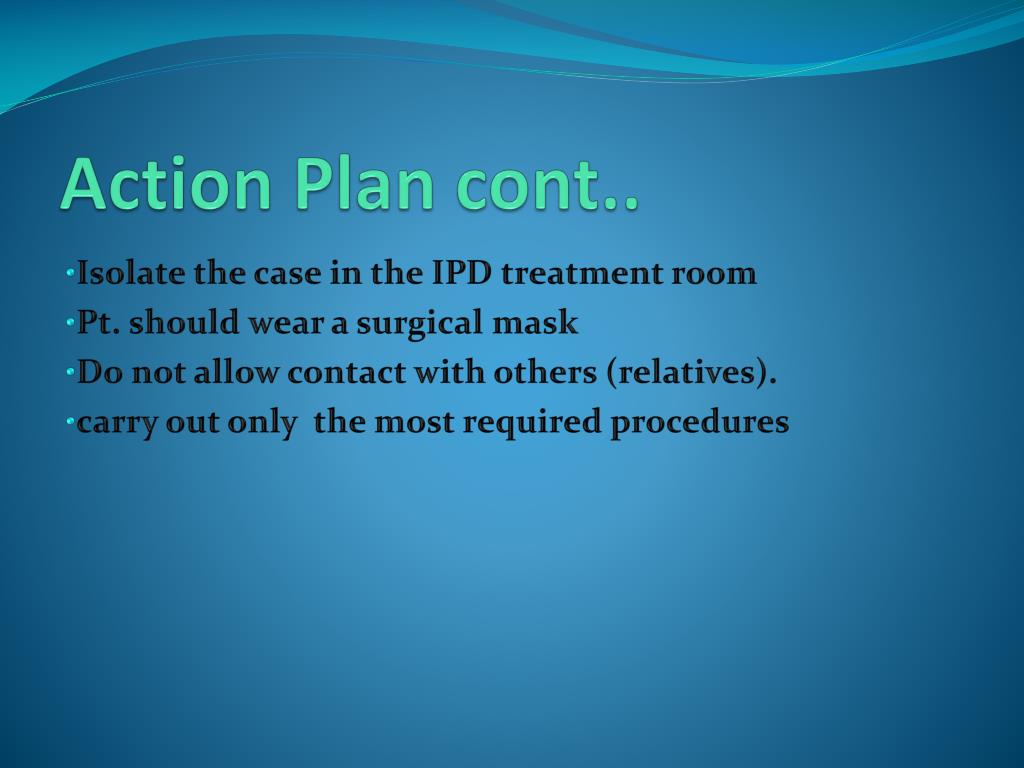 Action Plan cont.. Isolate the case in the IPD treatment room Pt. should wear a surgical mask Do not allow contact with others (relatives). carry out only the most required procedures