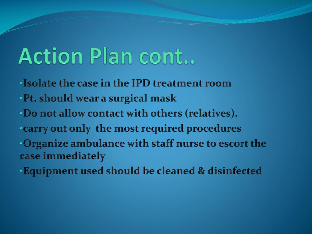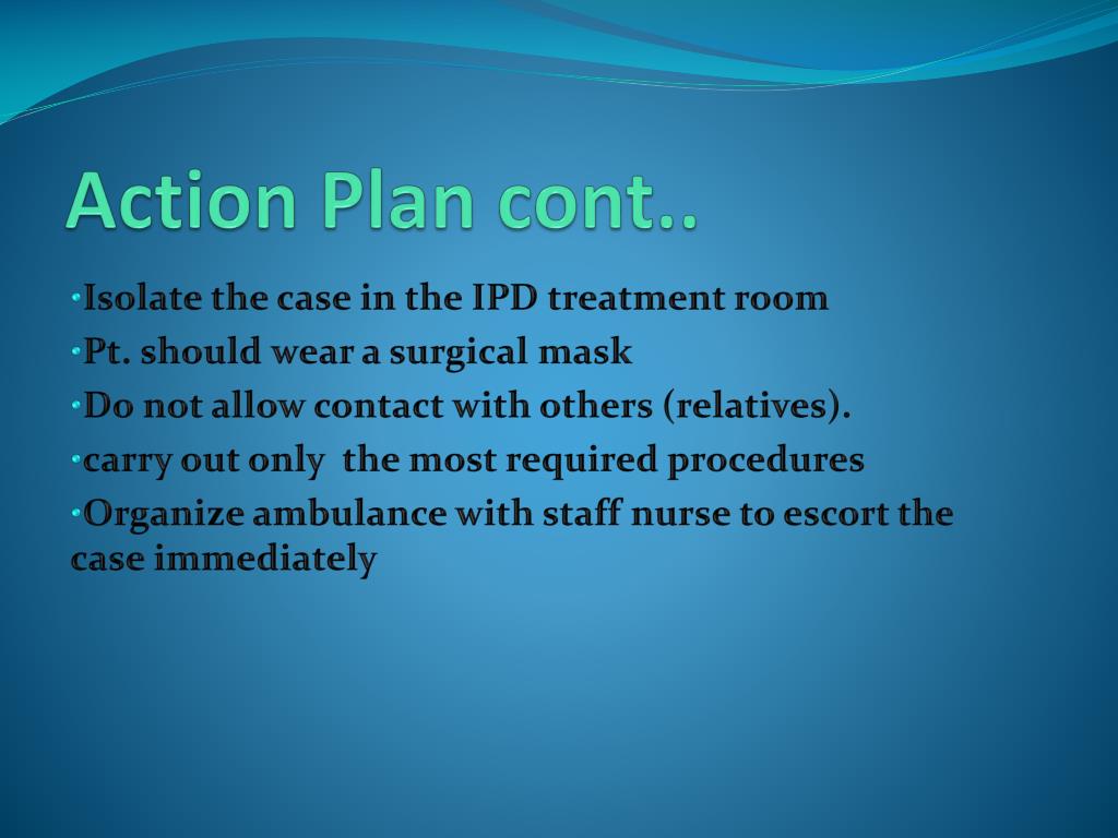 Action Plan cont.. Isolate the case in the IPD treatment room Pt. should wear a surgical mask Do not allow contact with others (relatives). carry out only the most required procedures Organize ambulance with staff nurse to escort the case immediately