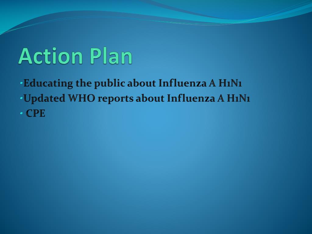 Action Plan Educating the public about Influenza A H1N1 Updated WHO reports about Influenza A H1N1 CPE