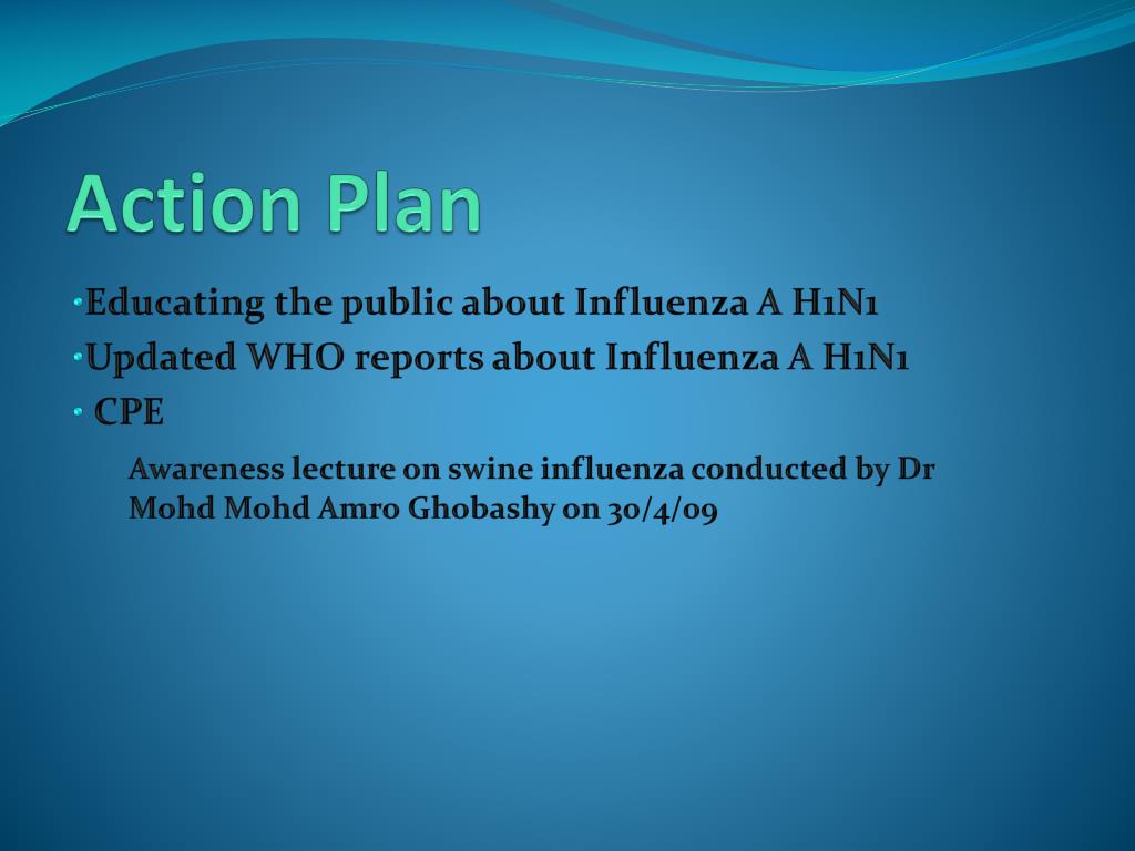 Action Plan Educating the public about Influenza A H1N1 Updated WHO reports about Influenza A H1N1 CPE Awareness lecture on swine influenza conducted by Dr Mohd Mohd Amro Ghobashy on 30/4/09