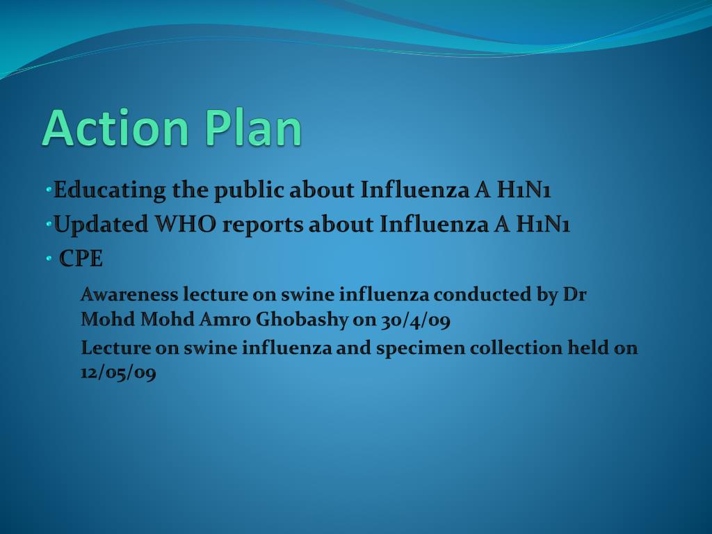 Action Plan Educating the public about Influenza A H1N1 Updated WHO reports about Influenza A H1N1 CPE Awareness lecture on swine influenza conducted by Dr Mohd Mohd Amro Ghobashy on 30/4/09 Lecture on swine influenza and specimen collection held on 12/05/09
