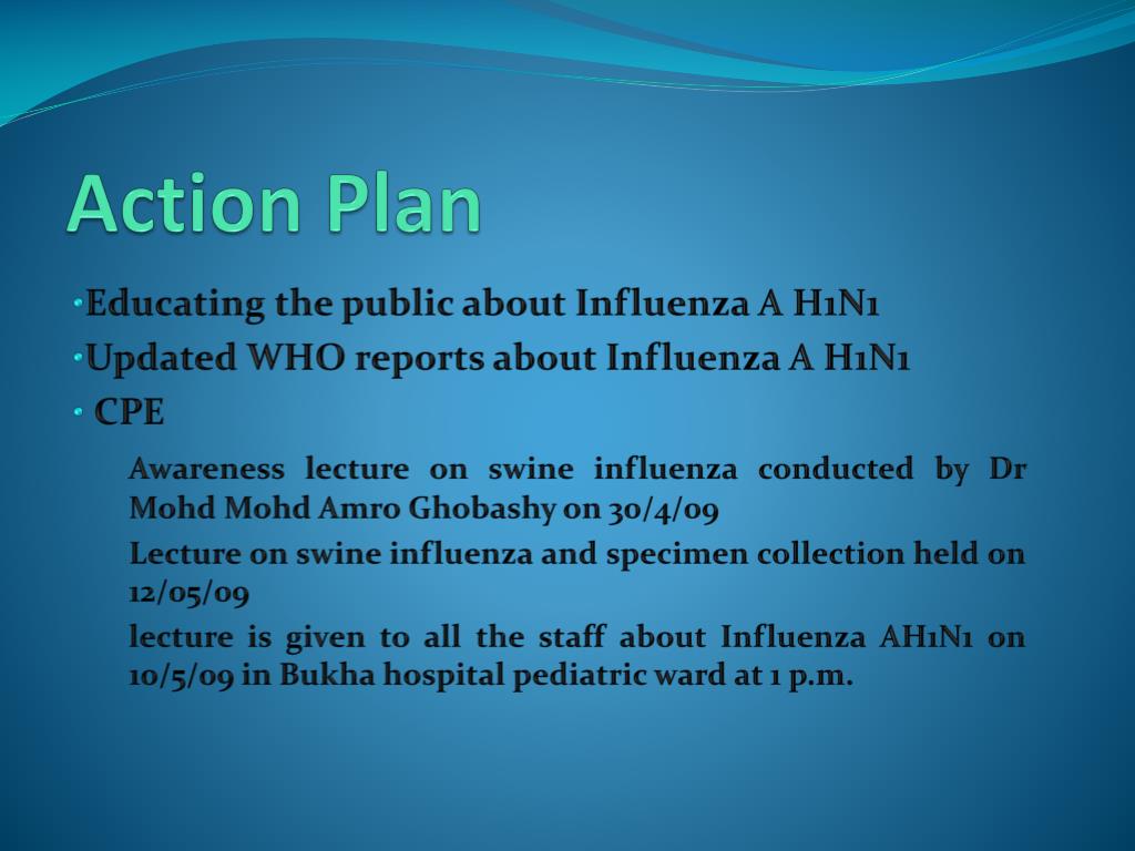 Action Plan Educating the public about Influenza A H1N1 Updated WHO reports about Influenza A H1N1 CPE Awareness lecture on swine influenza conducted by Dr Mohd Mohd Amro Ghobashy on 30/4/09 Lecture on swine influenza and specimen collection held on 12/05/09 lecture is given to all the staff about Influenza AH1N1 on 10/5/09 in Bukha hospital pediatric ward at 1 p.m.