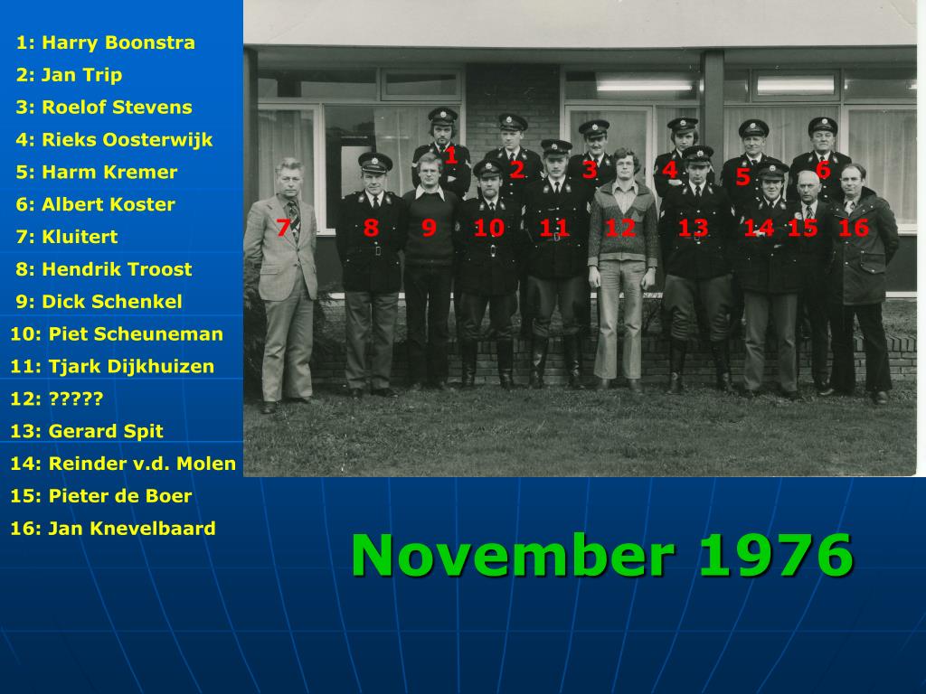 1: Harry Boonstra 2: Jan Trip 3: Roelof Stevens 4: Rieks Oosterwijk 5: Harm Kremer 6: Albert Koster 7: Kluitert 8: Hendrik Troost 9: Dick Schenkel 10: Piet Scheuneman 11: Tjark Dijkhuizen 12: ????? 13: Gerard Spit 14: Reinder v.d. Molen 15: Pieter de Boer 16: Jan Knevelbaard 1 2 3 4 6 5 7 8 9 10 11 12 13 14 15 16 November 1976