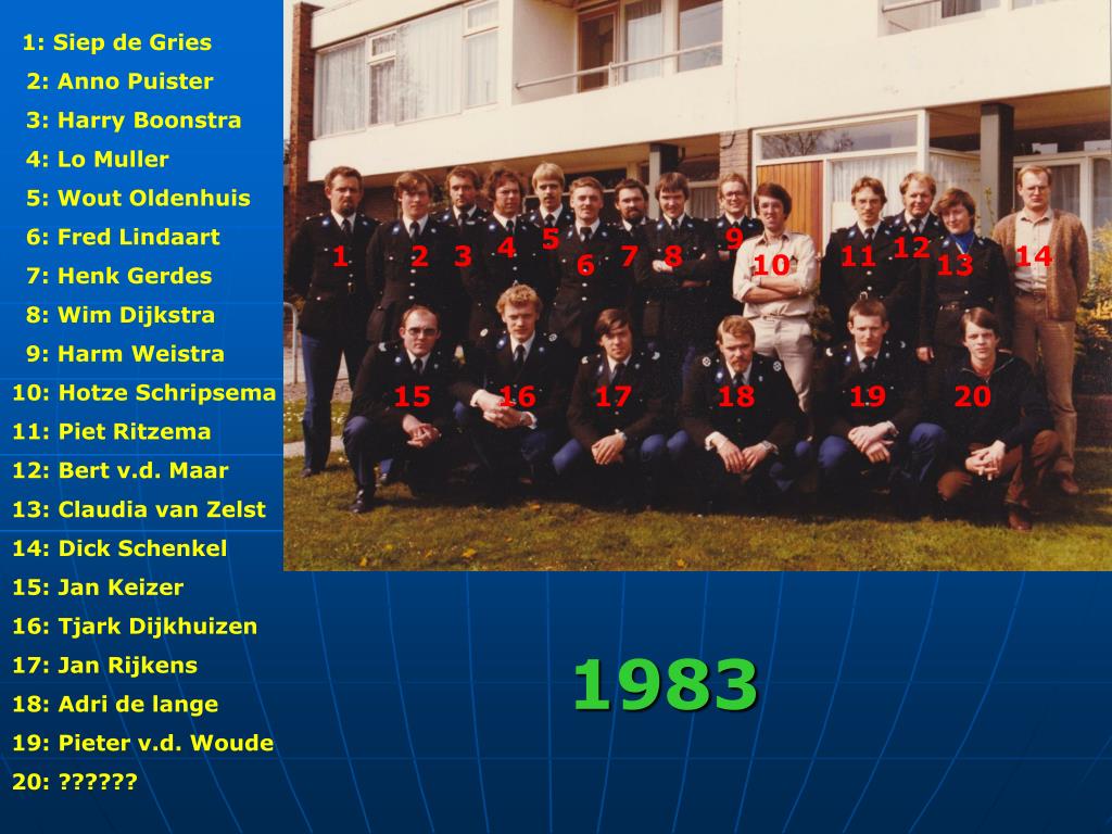 1: Siep de Gries 2: Anno Puister 3: Harry Boonstra 4: Lo Muller 5: Wout Oldenhuis 6: Fred Lindaart 7: Henk Gerdes 8: Wim Dijkstra 9: Harm Weistra 10: Hotze Schripsema 11: Piet Ritzema 12: Bert v.d. Maar 13: Claudia van Zelst 14: Dick Schenkel 15: Jan Keizer 16: Tjark Dijkhuizen 17: Jan Rijkens 18: Adri de lange 19: Pieter v.d. Woude 20: ?????? 5 9 4 12 1 2 3 7 8 11 14 6 10 13 15 16 17 18 19 20 1983
