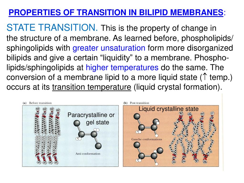 PROPERTIES OF TRANSITION IN BILIPID MEMBRANES: STATE TRANSITION. This is the property of change in the structure of a membrane. As learned before, phospholipids/ sphingolipids with greater unsaturation form more disorganized bilipids and give a certain “liquidity” to a membrane. Phospho- lipids/sphingolipids at higher temperatures do the same. The conversion of a membrane lipid to a more liquid state ( temp.) occurs at its transition temperature (liquid crystal formation). Liquid crystalline state Paracrystalline or gel state