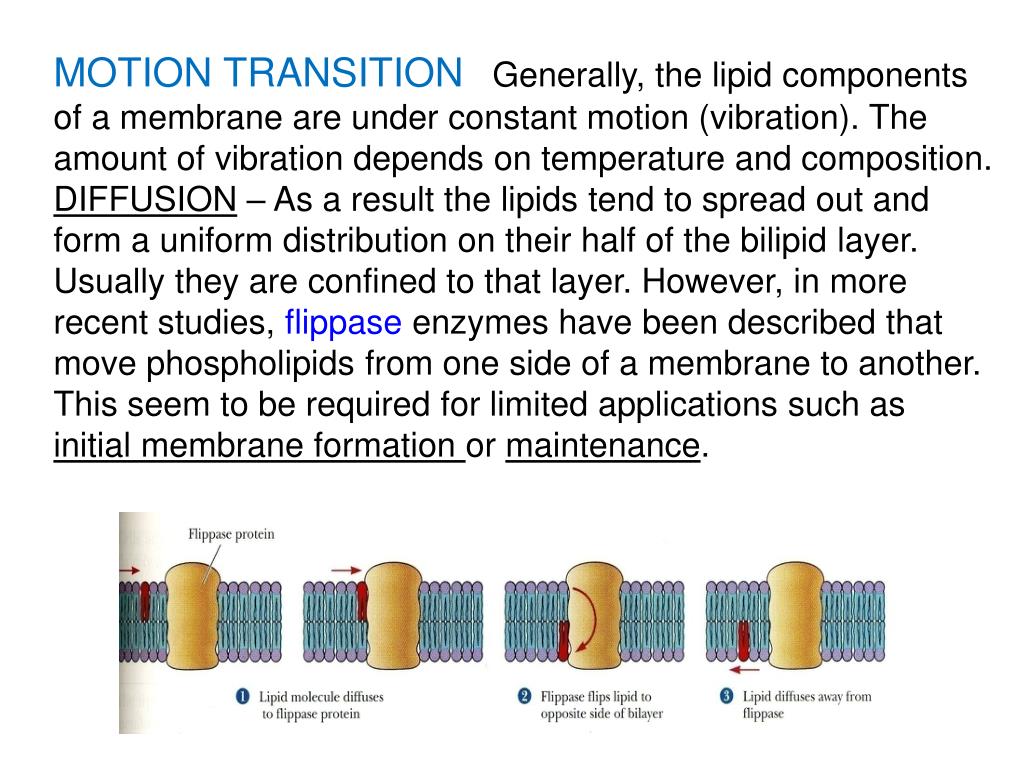MOTION TRANSITION Generally, the lipid components of a membrane are under constant motion (vibration). The amount of vibration depends on temperature and composition. DIFFUSION – As a result the lipids tend to spread out and form a uniform distribution on their half of the bilipid layer. Usually they are confined to that layer. However, in more recent studies, flippase enzymes have been described that move phospholipids from one side of a membrane to another. This seem to be required for limited applications such as initial membrane formation or maintenance.