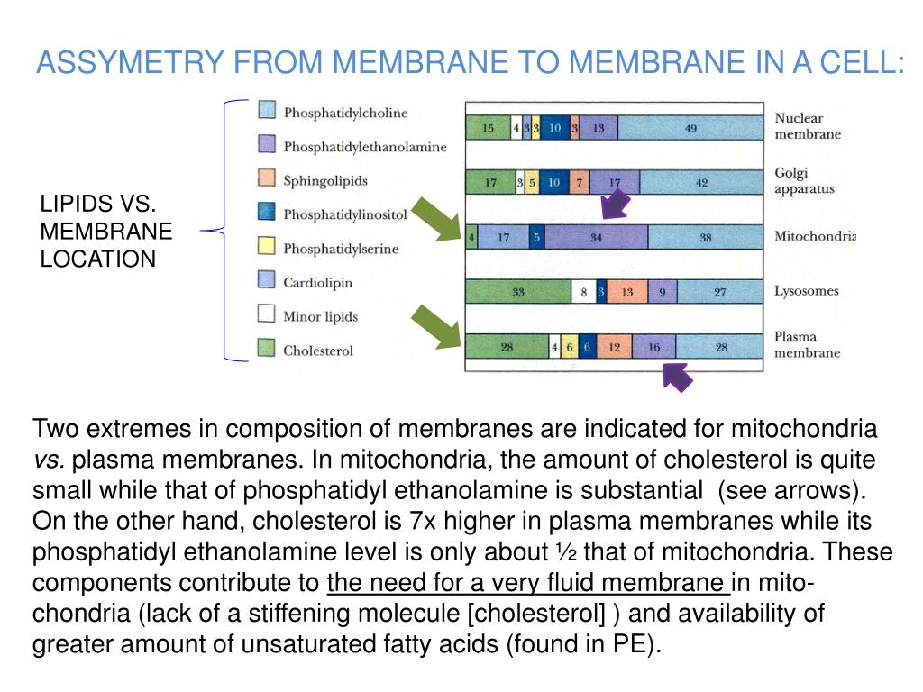 ASSYMETRY FROM MEMBRANE TO MEMBRANE IN A CELL: LIPIDS VS. MEMBRANE LOCATION Two extremes in composition of membranes are indicated for mitochondria vs. plasma membranes. In mitochondria, the amount of cholesterol is quite small while that of phosphatidyl ethanolamine is substantial (see arrows). On the other hand, cholesterol is 7x higher in plasma membranes while its phosphatidyl ethanolamine level is only about ½ that of mitochondria. These components contribute to the need for a very fluid membrane in mito- chondria (lack of a stiffening molecule [cholesterol] ) and availability of greater amount of unsaturated fatty acids (found in PE).